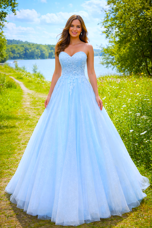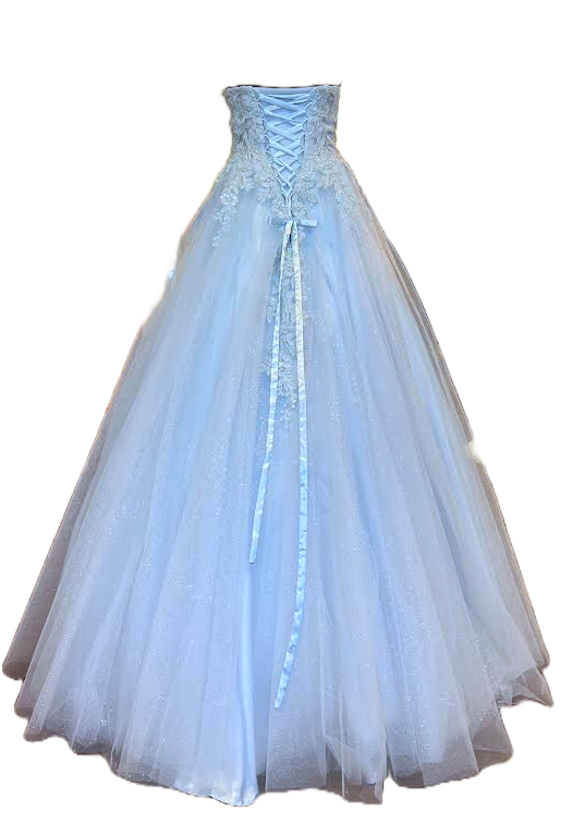 En lång, ljusblå balklänning med en romantisk och sagolik känsla. Den har en figurnära, ärmlös överdel med hjärtformad urringning. Livet är dekorerat med spetsapplikationer och broderade detaljer som ger struktur och ett elegant intryck.