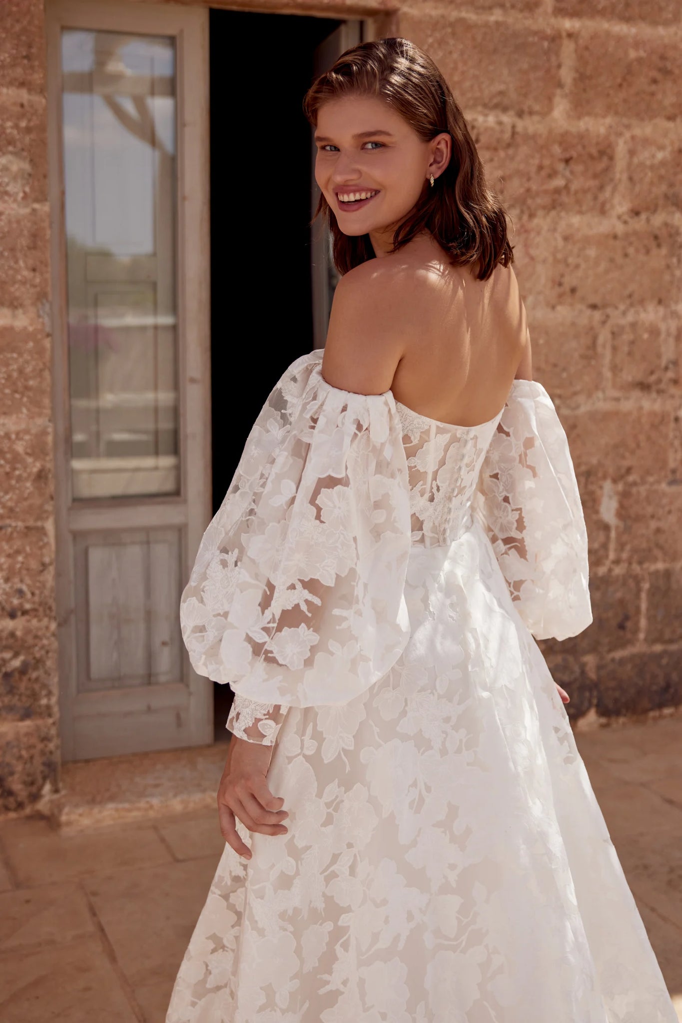 Jacquardklänning i A-linje med rak urringning och modest V-bak. Transparent överdel med synliga skenor. Komplett med klädda knappar på bakstycket och vackert släp. Stilen kombineras med matchande off-shoulder-puffärmar.