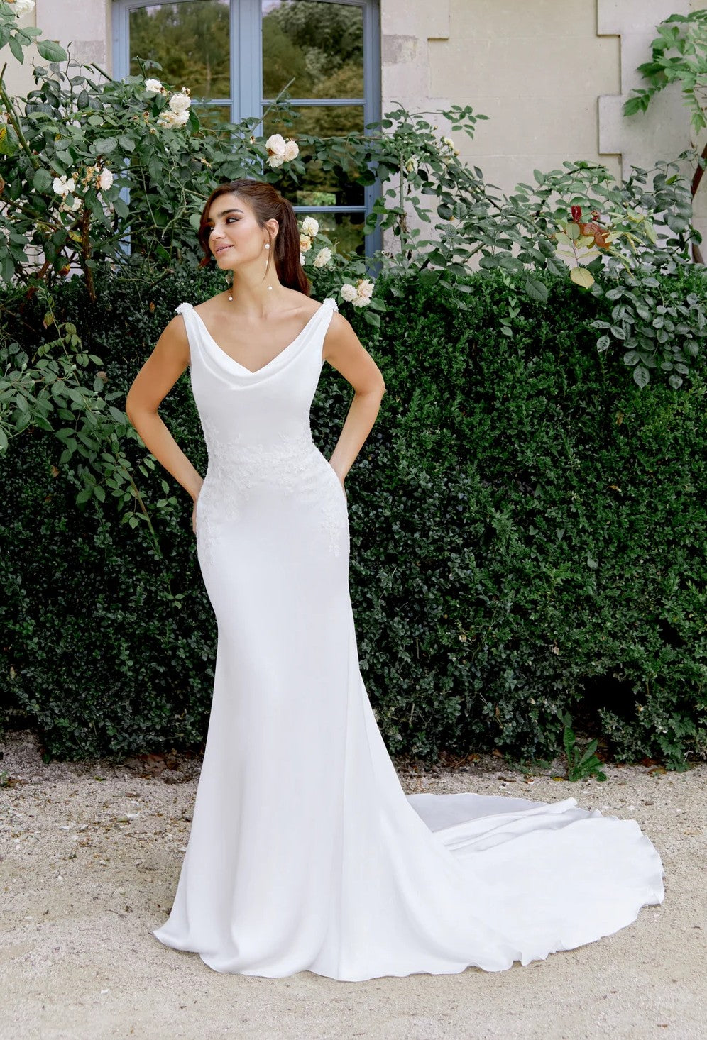 Charmeuse-klänning med figurnära topp och utsvängd kjol samt draperad ringning. Mitten av livet är prydd med ton-i-ton pärl- och paljettbroderade spetsapplikationer som rinner ner längs sidorna vid midjan. Låg rygg kompletteras med drapering och knappar täckta med charmeuse. Avslutas med ett vackert släp.