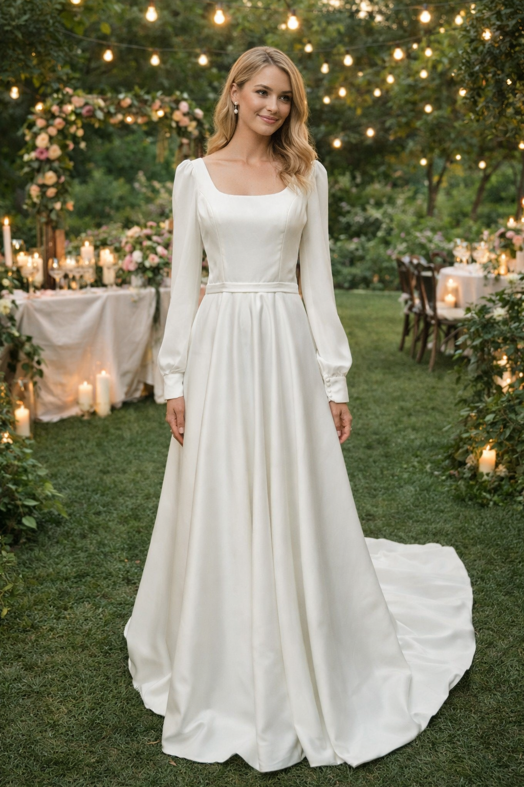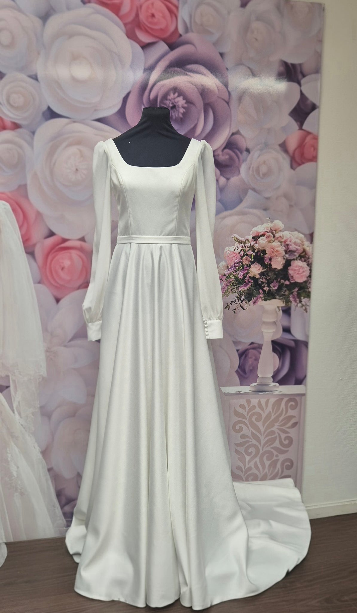 Långärmad och golvlång med ett svepande släp som ger en romantisk känsla. Mjuk fyrkantig urringning. Figurnära liv med en subtil markerad midja, med ett skärp i samma material. V-ringad djup rygg samt klädda knappar hela vägen ut på det vackra släpet.